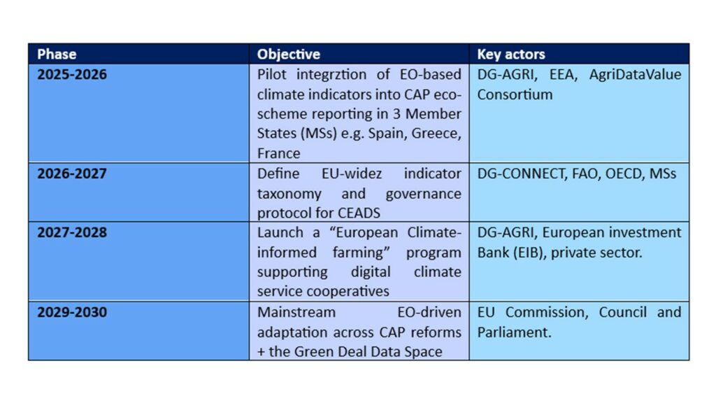 A. Establish an EU framework for climate-informed agriculture: Create a dedicated “EU Climate Intelligence for Agriculture” initiative under the Green Deal Data Space and the Common European Agricultural Data Space (CEADS).