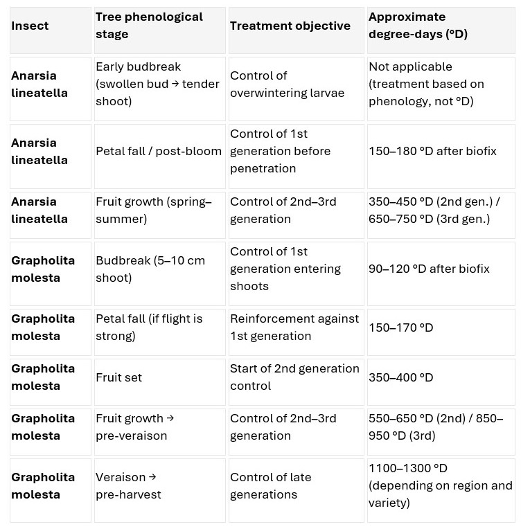The following table provides a brief summary of the relationship between the phenological moments when treatments should be applied in stone and pome fruit trees, along with the degree‑days (°D) required for Anarsia lineatella and Grapholita molesta, calculated from the following biofix points: